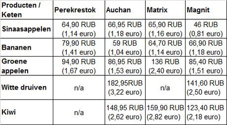 De Russische website progrodsamara.ru publiceerde onlangs een overzicht van de prijzen voor verschillende producten in Russische supermarkten. De cijfers geven een inkijkje in het prijspeil in de Samara, een miljoenenstad op een kleine 1000 kilometer ten oosten van Rusland.