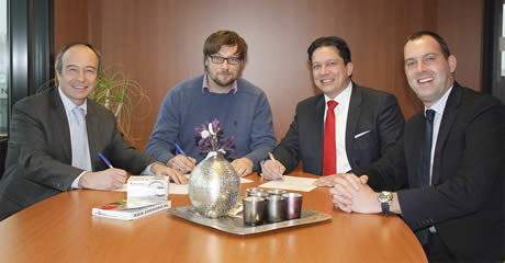 Vlnr: Jeroen Ottevanger (XOLV), André van der Wiel (Tacler Services), Norbert Holthaus en Klaas Kruise (Atradius)