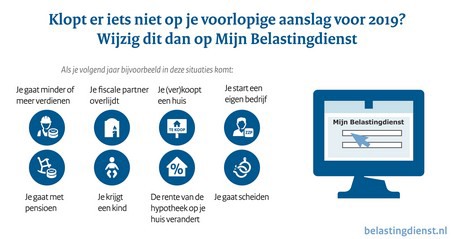 De hoogte van de voorlopige aanslag kan niet alleen wijzigen door veranderingen in de persoonlijke situatie, maar ook naar aanleiding van wetswijzigingen uit het Belastingplan. Voor 2019 heeft de Belastingdienst de wijzigingen in de belastingregels alvast verwerkt. De voorlopige aanslag kan hierdoor veranderen.