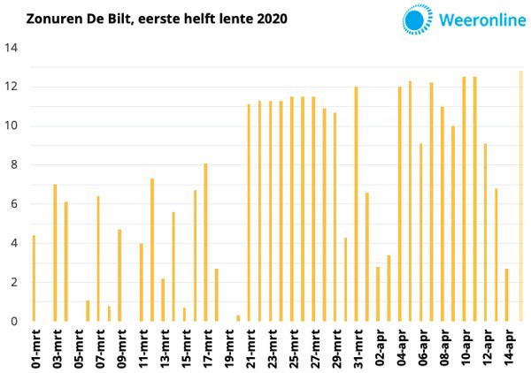 Met circa 336 uur zon is de eerste helft van de meteorologische lente van 2020 de zonnigste sinds het begin van de metingen. Recordhouder was 2003 met 315 zonuren in de eerste lentehelft. Het is dit jaar bovendien behoorlijk droog en ruim een graad warmer dan normaal. Ook de vooruitzichten voor de komende twee weken geven overwegend droog weer met regelmatig zon.