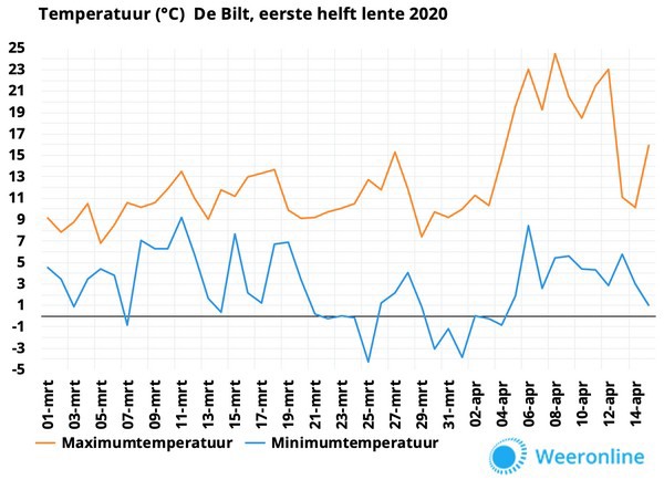 De gemiddelde temperatuur (zowel de dagen als de nachten samen) sinds 1 maart is 7,9 graden. Hiermee is het ruim een graad warmer dan normaal. De afgelopen drie weken zagen we wel flinke verschillen. Zo vroor het eind maart en begin april in de vroege ochtend lokaal matig, maar werd het vorige week al regionaal zomers warm.