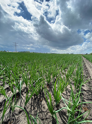 Vooruitblikkend op het nieuwe seizoen, valt dit jaar opnieuw de droogte op. "Gelukkig is er de laatste week wat regen gevallen, maar met de wind, zon en hoge temperaturen draaien de eerste haspels alweer. De vroege plantuien staan er hier in Zeeland redelijk voor en percelen in Brabant hebben me op plaatsen positief verrast (foto rechts perceel Jetset in Brabant). Die zijn veelal wat vroeger geplant en dat op lichtere zandgrond. Ik verwacht de nieuwe uien net zo vroeg als anders, al zullen de volumes wellicht wat meer verspreid komen. Maar dat kan ook weer positief zijn, want dan komt niet alles tegelijk", besluit de uienverpakker nuchter.