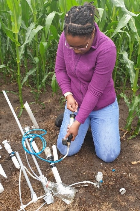 Foto rechts: Dominique Narain-Ford bemonstert een landbouwveld in Haaksbergen