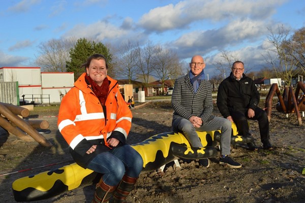 Charlotte Mauritz, Maurice Wubben en Sven Stimac in een speeltuin in aanbouw op het 60 hectare grote Floriade-terrein.