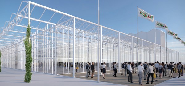 Een impressie van de kas, 170 meter lang, met voor de helft sierteelt en voor de helft voedingstuinbouw erin. Foto: ©V8 Architects