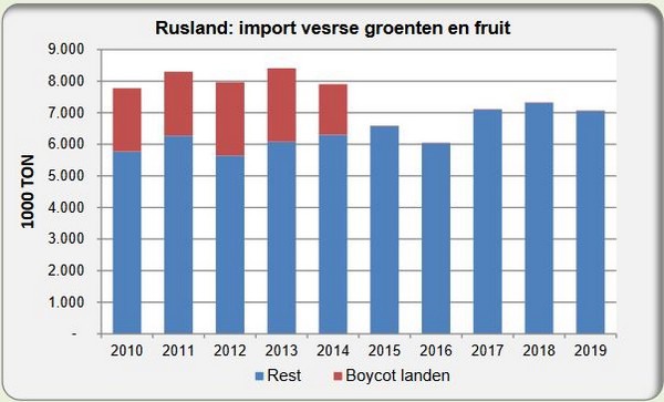 Rusland is wereldwijd gezien nog altijd de derde (in volume) importeur van verse groenten en fruit wereldwijd. In het afgelopen jaar ging het om een totaal van 7,1 miljoen ton. Dit jaar zal het een paar procent meer worden. In 2018 was het met 7,3 miljoen ton meer. In de jaren tussen het van kracht worden van de importboycot van een groot aantal landen en nu was het minder met een dieptepunt in 2016. Toen werd er maar 6,0 miljoen ton ingevoerd mede omdat er alleen in dat jaar ook een gedeeltelijke boycot op de import van Turks product gold. In de jaren vlak voor het invoeren van de boycot importeerde Rusland veel meer met een piek in 2013 van 8,4 miljoen ton. Hiervan kwam 2,3 miljoen ton uit de boycot-landen.