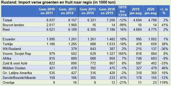 In het huidige corona-jaar is er in Rusland in de eerste 8 maanden 2% meer verse groenten en fruit ingevoerd dan in dezelfde periode van vorig jaar. Er kwam vooral minder via Belarus het land binnen. Vooral vanuit Turkije werd meer ingevoerd. Er is ook veel minder Marokkaans product ingevoerd. Ook vanuit Egypte werd minder ingevoerd. Vanuit Zuid-Afrika werd dit jaar juist weer veel meer ingevoerd. Het gat dat ontstond door de boycot is dus maar gedeeltelijk ingevuld door import uit andere landen. In 2018 en 2019 is in Rusland gemiddeld 12% minder verse groenten en fruit ingevoerd dan in 2013 en 2014. Pas dit jaar is de import uit Turkije wel op het niveau van de “korte” boycot in 2018. Andere landen hebben 1,1 miljoen ton of wel een kwartmeer verse groenten en fruit aan Rusland kunnen leveren. Hiervan betrof 0,2 miljoen ton bananen uit Ecuador. Het grootste deel van het gat werd opgevuld met import voormalige Sovjetrepublieken.