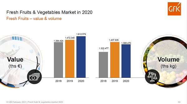 Het winkelmandje van een Poolse consument bestaat voor 10,7 % uit groente en fruit en steeg in 2020 met 8,4 procent. Opvallend is dat bananen in waarde (18%) op 1 staan in Polen. In volume daalde het aandeel appels (-12%) afgelopen jaar, bananen stegen juist met 22%. Nummer 1 groente in Polen is net als in Nederland de tomaat. In marktwaarde steeg de afzet van fruit met 10%, ten opzicht van een volume daling van 1 %. De marktwaarde van groenten steeg zowel in waarde als in volume met 6%