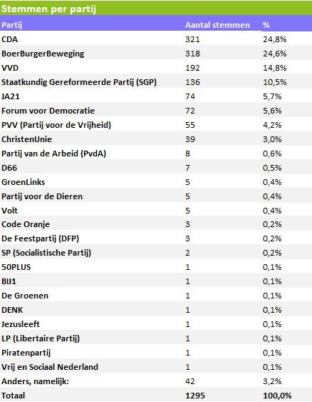 De andere partijen blijven achter op CDA en BBB. 14,8% is van plan om te stemmen op de VVD. 10,5% kiest voor de SGP. Gevolgd door JA21 (5,7%), Forum voor Democratie (5,6%) en de PVV (4,2%) Hieronder een overzicht van de percentages per partij: