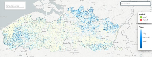 De WaterRadar visualiseert naast het wateraanbod ook de theoretische irrigatiebehoefte op regionale schaal. Daarvoor brachten de projectpartners de aanwezige teelten op de percelen over heel Vlaanderen in kaart voor 2020. Per gewas(groep) maakten ze vervolgens een ruwe inschatting van de extra irrigatiebehoefte voor het volledige groeiseizoen, bovenop de natuurlijke neerslag. Ze gingen daarbij uit van een normaal weerpatroon (en dus niet de extremen van de voorbije drie jaren). De kaart maakt in één oogopslag duidelijk in welke regio’s de potentiële watervraag het hoogst is.