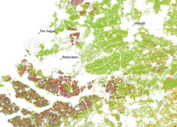 Voorbeeld detail: in de Kop van Noord-Holland worden veel bollen geteeld (geel=tulp, roze=lelie).