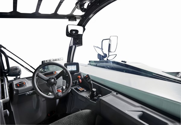 "Rijden en werken met de machine is ook veel comfortabeler dankzij een nieuwe Grammer Maximo Dynamic-stoel met luchtvering, voorzien van armleuning met vering en joystick. Het nieuwe lcd-kleurendisplay biedt alle noodzakelijke informatie. De verreiker is ook leverbaar met een groter 7-inch touchscreen met ingebouwde radio en een telefoonscherm waarmee de bestuurder contactpersonen vrijwel direct kan bellen. Voor meer veiligheid en een groter rijgemak wordt het beeld van de achteruitkijkcamera op het display getoond zodra de machine in de achteruit wordt geschakeld. De elektrische rechterspiegel kan ook snel vanuit de cabine worden versteld. Tenslotte is er een compleet verlichtingspakket met LED-lampen aanwezig, dat 360° zicht biedt en de bestuurder 's nachts kan laten werken alsof het dag is."