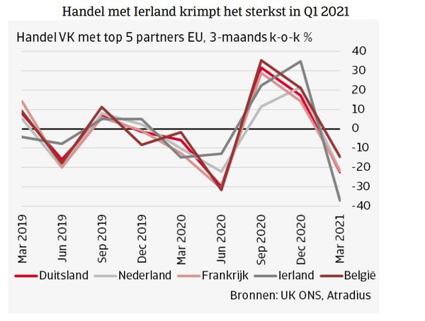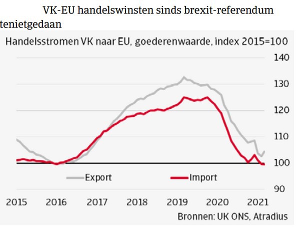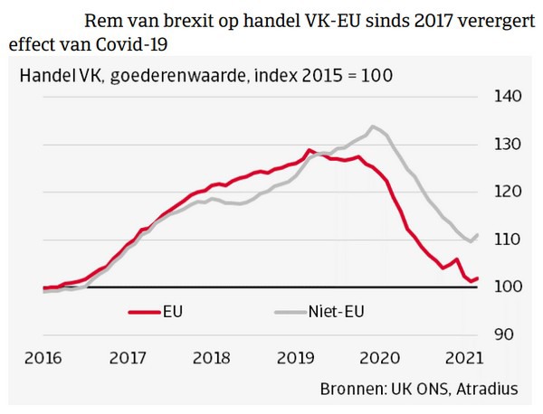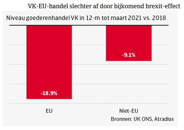 - Gecorrigeerd voor de volatiliteit door de pandemie is de handel van het VK met de EU met 18,9% gedaald. De handel tussen het VK en niet-EU-landen daalde slechts met 9%.