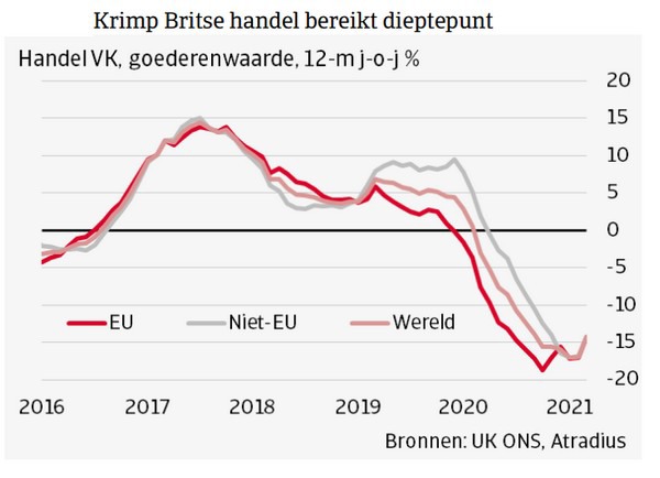 - De internationale handel van het Verenigd Koninkrijk is in maart 2021 met 14,3% j-o-j ingezakt doordat het einde van de overgangsperiode en het opleggen van een derde nationale lockdown hun tol eisten. De handel met de EU daalde in dezelfde mate als de handel met de rest van de wereld, maar dit geeft een vertekend beeld.