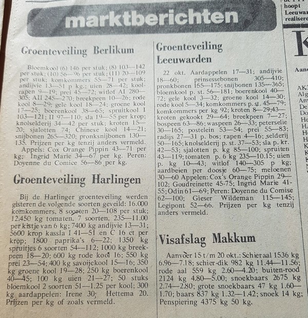 Maar ook naar de prijzen die er op de groenteveilingen van Berlikum, Harlingen en Leeuwarden werden betaald voor onder meer komkommers, kroten, breekpenen én appelen met rasnamen als Cox Orange Pippin en Ingrid Marie.