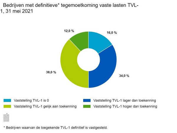 Van de ongeveer 32 duizend bedrijven waarvan de tegemoetkoming voor vaste lasten over juni-september 2020 (TVL-1) definitief is vastgesteld, moet 16 procent hun voorschot volledig terugbetalen. Ongeveer 34 procent behoudt de tegemoetkoming, maar deze wordt wel lager vastgesteld dan eerder aangegeven. Bij ongeveer 12 procent van de bedrijven wordt de tegemoetkoming juist hoger. Het verschil tussen het eerder toegekende en vastgestelde bedrag hangt samen met het verschil tussen het vooraf ingeschatte omzetverlies en de gerealiseerde omzet van het bedrijf. Dat meldt het CBS op basis van cijfers over steunmaatregelen voor bedrijven, gemaakt op verzoek van het ministerie van Economische Zaken en Klimaat (EZK).