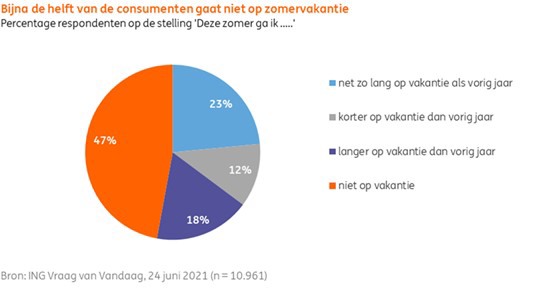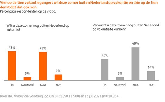 Met een oplopend aantal coronabesmettingen, zowel in Nederland als in andere Europese landen, valt de buitenlandse zomervakantie voor een aantal vakantiegangers dit jaar mogelijk alsnog in het water. Drie op de tien vakantiegangers verwacht deze zomer nog buiten Nederland op vakantie te kunnen. In juni gold dat nog voor vier op de tien. Dit blijkt uit de ING Vraag van Vandaag. Mocht Nederland vandaag op code rood gaan dan lijkt dat voor een meerderheid van de Nederlandse vakantiegangers geen nadelige gevolgen te hebben omdat zij sowieso kiezen voor een binnenlandse vakantie. Naar verwachting naderen de binnenlandse zomervakantie-uitgaven dit jaar het niveau van 2019. Dit komt onder meer door prijsstijgingen voor accommodaties en in de horeca.