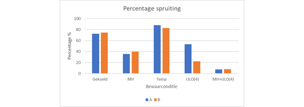 De verschillende condities vertoonden dit bewaarseizoen een significant verschillend effect op het percentage spruiting en ook op de mate van spruiting. De ULO-bewaring stak hierbij het meest gunstig af ten opzichte van de andere alternatieven. Het effect van de condities was voor beide beoordelingsmomenten vergelijkbaar, maar het percentage spruiting lag bij de beoordeling in maart tot 50% lager.
