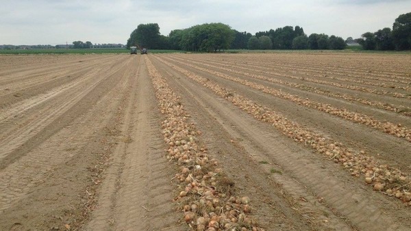 Tholen – Momenteel zorgt het overschot op de uienmarkt ervoor dat de verkoopprijs van uien op een laag niveau zit. Bovendien zijn er niet alleen grote aantallen, maar gemiddeld genomen vallen de kalibers ook groot uit doordat het natte weer in de laatste maanden de groei heeft bevorderd. Dit maakt dat veel uientelers hogere oogstopbrengsten per ha kunnen realiseren dan voorgaande jaren. Dit in combinatie met het uitblijven van export maakt dat de kiloprijs enorm is gezakt. Zelfs zo hard dat een uienteler uit Nederland afgelopen week 200 ton aan gerooide uien op zijn perceel liet liggen, want de marktprijs (die op dat moment op 2 cent per kg lag) zat onder de kostprijs. In België is op dit moment de prijs van uien weer wat gestegen. De plantuien komen nu rond de 7 cent per kg en de zaaiuien op 8 cent.
