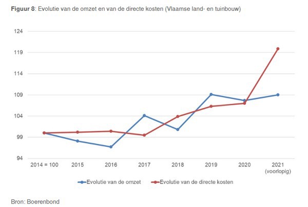 De directe kosten zijn dit jaar uitzonderlijk gestegen, met maar liefst 12,1% tegenover 2020 voor alle land- en tuinbouwsectoren. In 2021 gaat 87,5% van de gerealiseerde omzet op in directe kosten. Met 750 miljoen euro bruto toegevoegde waarde noteert de sector een dieptepunt over een periode van bijna 20 jaar, ondanks de op 2 na hoogste omzet in diezelfde periode.