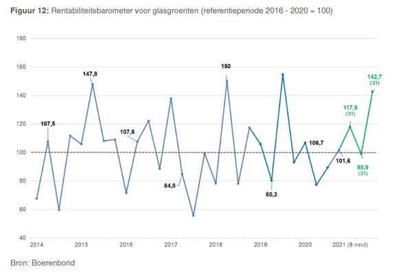 Kosten en prijzen samen levert een rentabiliteitscijfer op. Sinds 2016 werkt de Boerenbond daarvoor met een barometer. Dit gaat in 2021 boven het vijfjarig gemiddeld door, vooral door betere prijzen voor paprika en tomaat.