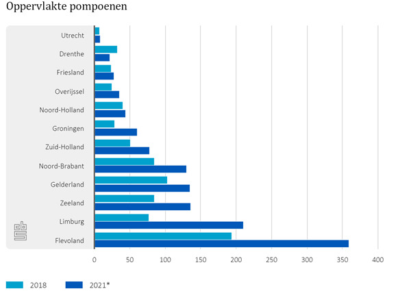 Het areaal pompoenen in Nederland is in de periode 2018-2021 met 66% gestegen tot 1249 hectare. Bijna 30% van de pompoenteelt is in Flevoland te vinden, zo blijkt uit cijfers van het Centraal Bureau voor de Statistiek. Klik hier voor de achtergrondcijfers