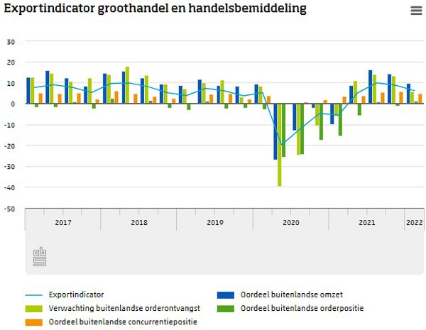 Ondernemers in de groothandel zijn aan het begin van het eerste kwartaal van 2022 ook minder optimistisch over de export dan in het vierde kwartaal van 2021. De exportindicator komt uit op 6,2 punten, tegen 8,8 punten in het vorige kwartaal. Zowel het oordeel over de buitenlandse omzet als de verwachtingen voor de buitenlandse orderontvangst verslechterden, maar bleven positief. Het oordeel over de buitenlandse orderpositie sloeg daarentegen in het eerste kwartaal om van gematigd negatief (vierde kwartaal van 2021) naar gematigd positief, en is hiermee de enige deelindicator die een verbetering laat zien. Over de buitenlandse concurrentiepositie oordeelden groothandelaren iets minder positief dan in het vierde kwartaal.