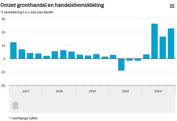 In 2021 heeft de groothandel en handelsbemiddeling 17,1 procent meer omzet behaald dan in 2020. Het aantal faillissementen onder groothandelaren nam sterk af ten opzichte van het voorgaande jaar. De verwachtingen van ondernemers in de groothandel over de omzet en de export waren in het eerste kwartaal van 2022 minder optimistisch dan in het vierde kwartaal van 2021. Dit meldt het CBS op basis van nieuwe cijfers.
