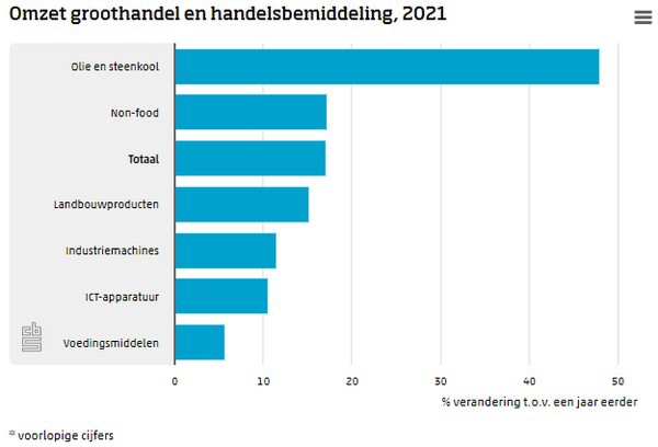 In 2021 behaalden groothandelaren in olie en steenkool 48 procent meer omzet dan een jaar eerder. Deze grote stijging kwam mede doordat de oliehandel in 2020 bijna 32 procent minder omzette en te maken had met lage prijzen en met minder vraag als gevolg van de coronamaatregelen. De groothandel in non-food (18,4 procent), landbouwproducten (17,2 procent), industriemachines (14,6 procent), voedingsmiddelen (10,9 procent) en ICT-apparatuur (9,1 procent) boekten in 2021 allemaal een hogere omzet dan in 2020.
