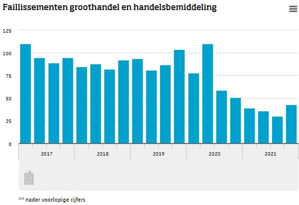 In 2021 werden 148 faillissementen uitgesproken in de groothandel en handelsbemiddeling. Het aantal lag daarmee ruim twee keer zo laag als in 2020. In het laatste kwartaal van 2021 registreerde het CBS 43 faillissementen. Na vijf kwartalen op rij met een daling was daarmee sprake van een toename in het aantal uitgesproken faillissementen.