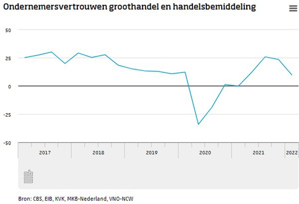 Het ondernemersvertrouwen in de groothandel en handels-bemiddeling kwam in het begin van het eerste kwartaal van 2022 uit op 9,9 punten. Daarmee was er een duidelijke afname van het vertrouwen van ondernemers in vergelijking met het vierde kwartaal van 2021 (23,5). Ondernemers waren in het eerste kwartaal vooral minder optimistisch over de omzetverwachting voor de komende drie maanden. Een hogere omzet wordt door per saldo 5,8 procent van de ondernemers verwacht. In het vierde kwartaal was dat nog 29,3 procent. De vragen uit het onderzoek zijn aan het begin van het eerste kwartaal van 2022 aan de ondernemers voorgelegd.