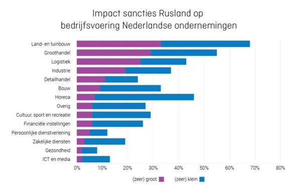 93% van de ondernemers doet geen zaken met Rusland, maar gevolgen worden wel breder ervaren, vooral in de sectoren land- en tuinbouw (33% grote of zeer grote gevolgen), Groothandel (29%), Logistiek (25%) en Industrie (19%). In de sectoren ICT/media, gezondheid, persoonlijke dienstverlening en zakelijke diensten geeft minimaal driekwart aan vrijwel géén gevolgen te ondervinden. Grotere bedrijven (met meer werkzame personen) ervaren verhoudingsgewijs meer gevolgen.