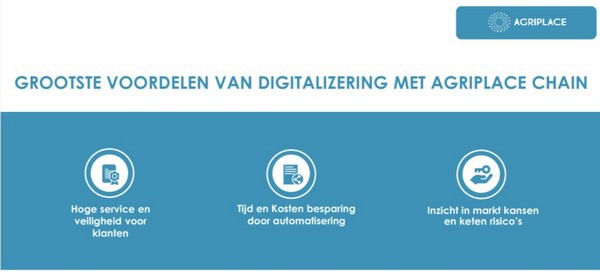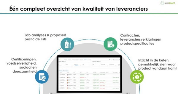 Met AgriPlace Chain kan, volgens Nico Broersen en Simon Elting van het gelijknamige bedrijf, tijd worden bespaard bij het geautomatiseerd verzamelen, valideren en delen van kwaliteits- en duurzaamheidsinformatie, terwijl het inzicht wordt vergroot. Simon legt uit dat het systeem een compleet overzicht geeft van de kwaliteit van leveranciers. Leveranciers kunnen, zo vertelt Simon, makkelijk hun informatie delen in het persoonlijke portaal van een handelaar en informatie over certificeringen en add-ons binnen de keten zijn met de druk op een knop beschikbaar. "Zo breng je de hele eigen toeleveringsketen in kaart en identificeer je snel risico's en kansen binnen de eigen keten", aldus Simon.