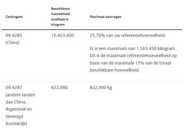 Voor knoflook uit andere landen (09.4287) mag men elke maand aanvragen zolang er nog hoeveelheid beschikbaar is. De beschikbare hoeveelheid kan worden aangevraagd.