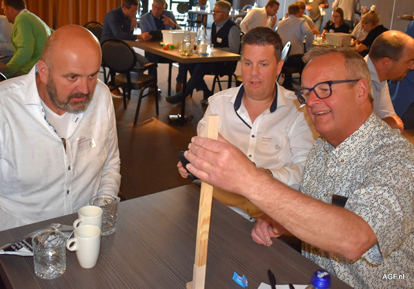 Opperste concentratie bij Piet van Liere, René Segers en Dignus Boone bij het bouwen van de Jenga-blokjes