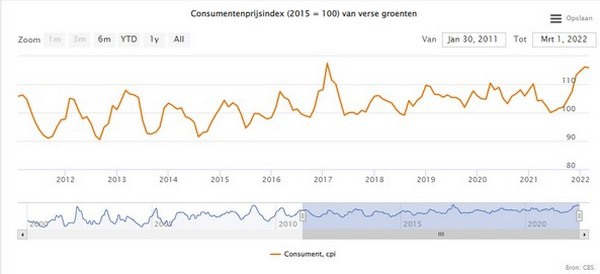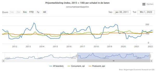 Over februari en maart stegen de voedselprijzen verder, zo meldt de WUR in haar update over de agrosector: agrimatie. De prijs van aardappelen steeg over deze twee maanden met 2 tot 3%. Verse groenten en fruit stegen met 1% in prijs. Ten opzichte van maart vorig jaar liggen de prijzen van groenten en aardappelen respectievelijk 11 en 18% hoger. De prijs van vers fruit ligt 5 tot 7% hoger dan vorig jaar in maart. Hieronder de actuele voedselprijzen van aardappelen, groenten en fruit.