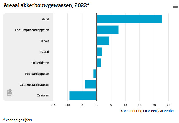 Het areaal akkerbouw is in 2022 met 10,5 duizend hectare (2,0 procent) toegenomen tot 536 duizend hectare. Het areaal gerst nam het meest toe, zaaiuien en zetmeelaardappelen worden in 2022 minder geteeld. Het areaal akkerbouwgewassen is sinds 2000 met ruim 15 procent afgenomen. Dit blijkt uit de voorlopige uitkomsten van de Landbouwtelling 2022 van het CBS.