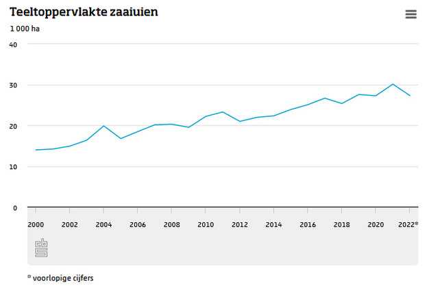 In 2022 besloeg het areaal zaaiuien 27,3 duizend hectare. Dat is 2,8 duizend hectare minder (-9,3 procent) dan een jaar eerder. Een jaar eerder nam de oppervlakte zaaiuien nog met 11,3 procent toe. Op een langere termijn heeft het areaal zaaiuien wel een groei doorgemaakt. Ten opzichte van het jaar 2000 is sprake van bijna een verdubbeling van het areaal.