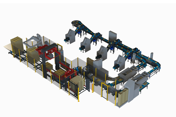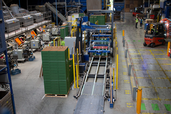 Eens gevuld met de kleinverpakkingen van 750 g, waarvan er acht in een standaarddoos passen, of met netjes van 500 g, die met 12 in een omdoos kunnen, belanden de dozen die bij beide casepackers vandaan komen centraal op één band, die ze naar een voorstapelaar voert. Daar worden de dozen in groepjes van twee op elkaar gestapeld en verder naar de palletiser geleid.