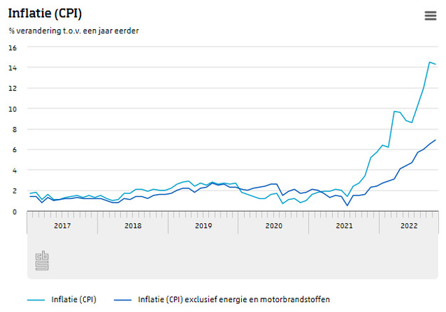 De inflatie wordt elke maand gemeten als de stijging van de consumentenprijsindex (CPI) ten opzichte van dezelfde maand in het voorgaande jaar. De consumentenprijsindex geeft het prijsverloop weer van een pakket goederen en diensten zoals dit gemiddeld wordt aangeschaft door de Nederlandse huishoudens. Een inflatie van 14,3 procent in oktober 2022 betekent dat de prijzen van consumentenproducten 14,3 procent hoger zijn dan in oktober 2021. De inflatie van 14,3 procent in oktober komt dus niet bovenop de inflatie van 14,5 procent in september.