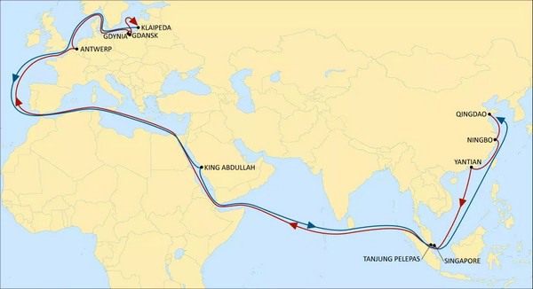 Het volledige traject bestaat uit de havens van Qingdao – Ningbo – Yantian – Tanjung Pelepas – Port of Antwerp-Bruges – Gdynia – Gdansk – Klaipeda – King Abdullah Port – Singapore – Qingdao.