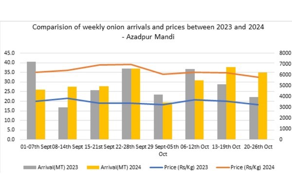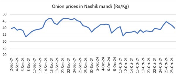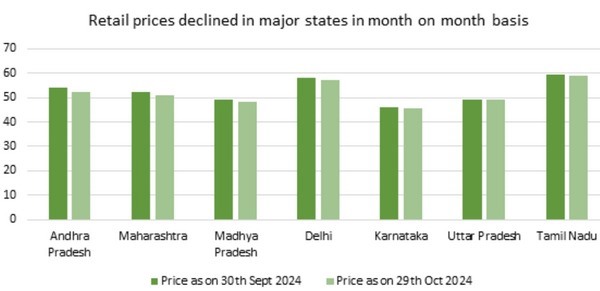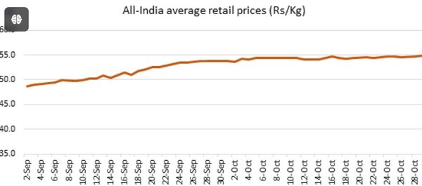 Sinds het begin van de afzet van uien tot op heden zijn de retailprijzen van uien aanzienlijk gestabiliseerd in belangrijke staten zoals Andhra Pradesh, Maharashtra, Karnataka, UP, Tamil Nadu en Delhi. De gemiddelde retailprijzen in heel India bleven in oktober grotendeels stabiel. Het vervoer van uien per spoor naar Guwahati zal de beschikbaarheid in de noordoostelijke staten vergroten en zal naar verwachting een drukkend effect hebben op de prijzen in de regio en ook op het gemiddelde voor heel India. De prijzen in Nashik mandi zijn ook gedaald na de piek van $0,63 per kg op 24 september.