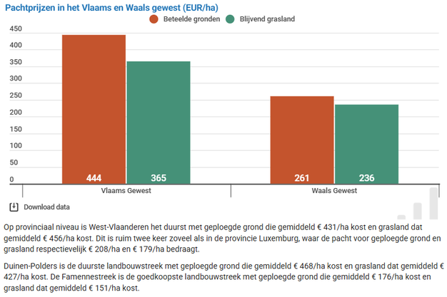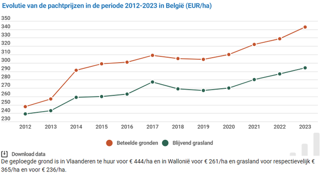 De geploegde grond is in Vlaanderen te huur voor € 444/ha en in Wallonië voor € 261/ha en grasland voor respectievelijk € 365/ha en voor € 236/ha.