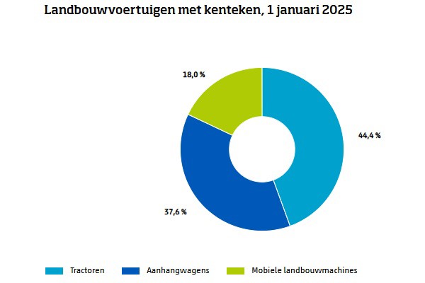 Op 1 januari 2025 telde Nederland 681 duizend landbouwvoertuigen met een kenteken. Onder landbouwvoertuigen vallen tractoren (303 duizend), aanhangers (256 duizend) en mobiele machines (122 duizend). Tractoren zijn met een gemiddelde leeftijd van 33 jaar relatief oud. Dit meldt het CBS op basis van nieuwe cijfers over het motorvoertuigenpark.