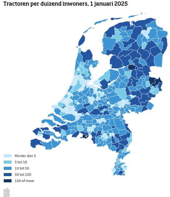 De gemeente Baarle-Nassau telde op 1 januari 2025 met 115,6 tractoren per duizend inwoners relatief de meeste tractoren, gevolgd door Tubbergen (110,0) en Staphorst (107,2). In de gemeente Rijswijk stonden met 0,2 tractor per duizend inwoners de minste tractoren geregistreerd. In Nederland waren er gemiddeld 17 tractoren per duizend inwoners.