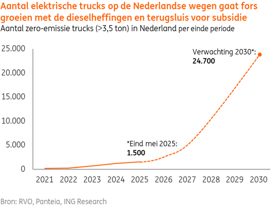 Veel ondernemers hebben eind 2024 nog een 'laatste rondje' Euro VI dieselvoertuigen besteld om tot 2030 de zero-emissie zones in steden nog mee in te mogen en flexibel te blijven. Dit neemt niet weg dat de focus nu verschuift naar elektrische trucks. Met de vrachtwagenheffing gaat de dynamiek op de truckmarkt veranderen en instroom van elektrische trucks versnellen. Niet alleen worden het gebruik en emissies belast, een groot deel van de verwachte opbrengst (bruto zo'n € 650 mln. in 2027) wordt teruggesluisd om de aankoop van e-trucks voordeliger te maken. En ook buitenlandse vrachtwagens gaan hieraan meebetalen (voor zo'n 20%). Met de vrachtwagenheffing gaan de aankoopsubsidies (AanZET-regeling) de komende jaren verdriedubbelen. De verwachting is daarbij dat het aantal e-trucks (>3,5 ton) zal groeien van ruim 1.500 halverwege 2025 naar 24.700 in 2030. Nederland is ook bij uitstek geschikt voor elektrische trucks, met 80% van de ritten onder de 150 kilometer en in 85% van de gevallen laden op depot, wat veelal voordeliger is.