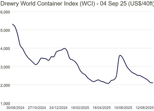 Na een daling van elf opeenvolgende weken is de World Container Index (WCI) van Drewry deze week tot stilstand gekomen. Deze stabilisatie is het resultaat van tegengestelde ontwikkelingen op verschillende handelsroutes. Zo hebben de sterk gestegen transpacifische vrachttarieven een opwaartse druk op de index uitgeoefend. Tegelijkertijd werden deze stijgingen grotendeels tenietgedaan door dalende tarieven op de route tussen Azië en Europa. Per saldo is de index daardoor stabiel gebleven.