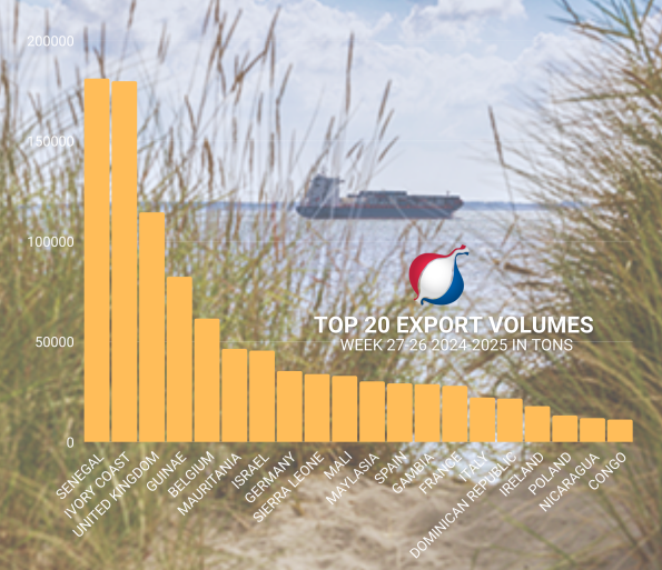 Op de exportmarkt voert Senegal opnieuw de lijst aan met ruim 181.000 ton. Ivoorkust volgt op de voet met bijna 180.000 ton, een groei van 77,5%. Groot-Brittannië blijft derde, maar zag de import opnieuw dalen (-14%). Opvallend is Israël, dat met een plus van bijna 71% naar plek 7 klom.