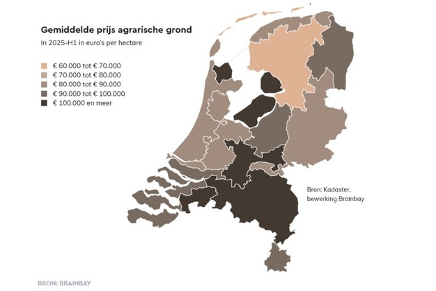 De gemiddelde prijs van agrarische grond in Nederland heeft voor het eerst de grens van 90.000 euro per hectare doorbroken. Uit gegevens van de Nederlandse Vereniging van Makelaars (NVM) blijkt dat telers en beleggers in 2025 gemiddeld 91.100 euro per hectare betalen, een recordniveau.