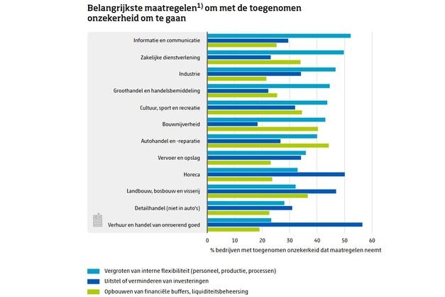 Van de ondernemers die meer onzekerheid ervaarden, nam 61 procent ook maatregelen. Maar er zijn grote verschillen per bedrijfstak. In de landbouw ligt dit aandeel met ongeveer 70 procent relatief hoog, terwijl het in de horeca met ongeveer 53 procent juist relatief laag is.
